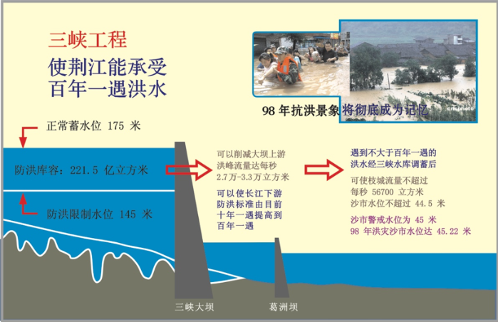 如果沒有三峽工程,荊江河段若遭遇類似歷史上出現(xiàn)過的1860、1870年特大洪水,兩岸堤防將潰決,洪水直趨洞庭湖,淹沒江漢平原,直接危及武漢市和京廣鐵路的安全,沖毀沿線鄉(xiāng)村、城鎮(zhèn)和工礦企業(yè),勢必造成大量人員傷亡和巨大經(jīng)濟(jì)損失。為了消除中華民族的心腹大患,因此將防洪功能作為三峽工程的首要功能。