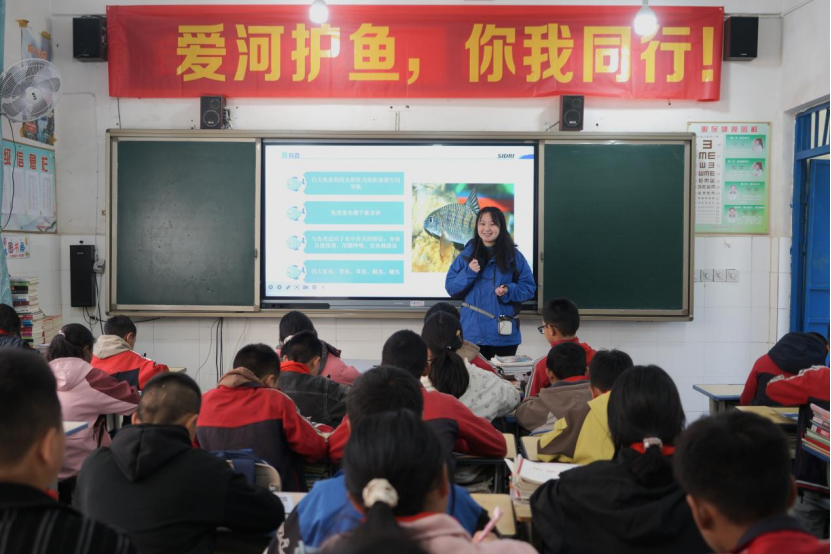 回到教室后,來自上海院的青年志愿者為孩子們講授了一堂生動的愛河護(hù)魚科普課。松新鎮(zhèn)小學(xué)班主任劉應(yīng)歡說:“我們有很多孩子的家在附近山上,參與放流活動能讓他們親近河流,體驗保護(hù)珍稀魚類的過程,讓他們從小建立保護(hù)生態(tài)環(huán)境的認(rèn)知。”